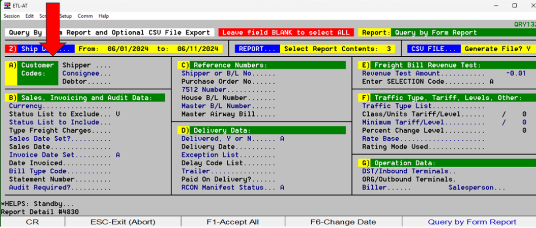 The charges screen now has an option to allow the query to be built based on the service due date instead of the shipping date. To change the query to service due date, select F6 and field Z will no longer read “Ship Date”.