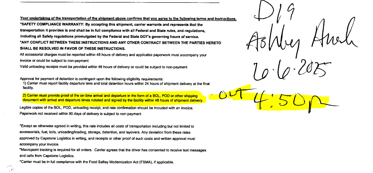 See below examples of rate confirmation notices. On wait time charges, we need clear and legible IN and OUT times on the BOL or DR. See below- we only had an OUT time, but no IN time.