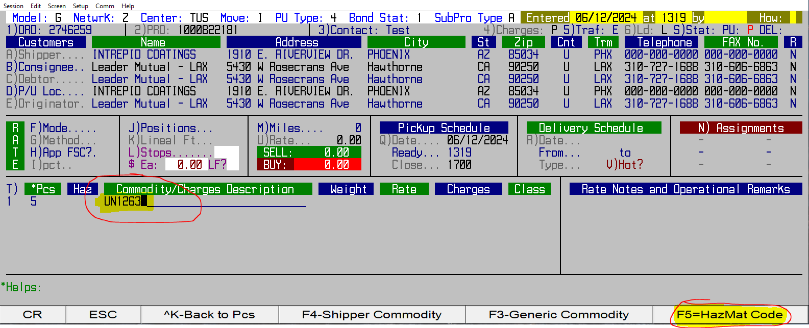 Next step is we need to make sure we enter the UN# then choose the F5 in the COMMODITY/CHARGES DESCRIPTION field.